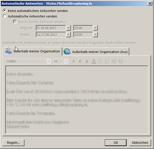 - Die Abwesenheitsnachricht für interne als auch externe Mails einschalten bzw. abschalten